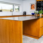 Køkkenøen er et centralt element i rummet, udstyret med en rummelig Heartsteeling-vask, som er lidt længere end en standardvask. Vaskens placering på køkkenøen er en praktisk løsning, som maksimerer bordpladsen og sikrer god arbejdsplads.